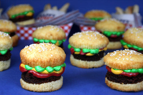 Những chiếc bánh cupcake nụ cười bỗng nhiên cũng hóa thành những chiếc hamburger vào ngày nói dối. Vẫn giữ nguyên hình dạng nhỏ xinh của mình, được tạo từ chính những chiếc bánh cupcake thông thường, các lớp bánh được cắt lát và kẹp lại với nhau để tạo thành những chiếc hamburger vô cùng độc đáo. Phần vỏ bánh hamburger được tạo từ lớp bánh vani, và phần nhân thịt được tạo từ lớp bánh sô-cô-la. Bạn sẽ cảm thấy rất ngạc nhiên khi lớp rau xanh lại được chế biến từ dừa và màu thực phẩm xanh lá cây nhưng cũng đem lại một cảm giác rất thật. Tùy sở thích của từng người mà lớp nhân bánh sẽ được đặt thêm nhiều lớp khác nhau tạo nên những chiếc bánh hamburger cupcake vô cùng đa dạng.
