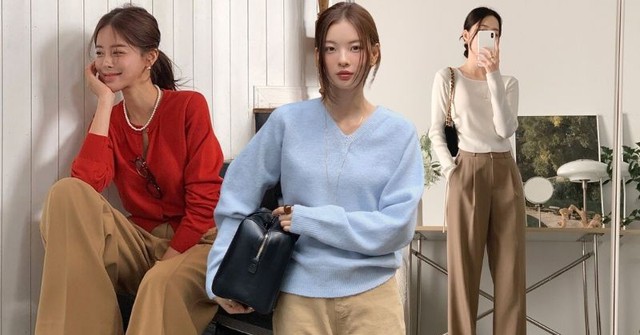 Mẫu áo len tăm cổ bẻ là mảnh ghép hoàn hảo cho tủ đồ mùa lạnh. Đối với mẫu áo mang tông màu trắng, viền nâu trên, quần âu màu be là "nửa kia" lý tưởng. Nhờ thiết kế áo len tăm dáng lửng mà chiều cao được hack hiệu quả, ngay cả khi chị em đi dép lê.