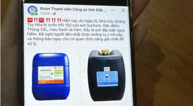 Chiều ngày 20/11, theo thông tin từ Công an tỉnh Đắk Lắk phát đi thông báo khẩn nhằm nhắc nhở người dân. Theo cơ quan chức năng cho biết, hiện nay Nhà máy đường Tuy Hòa bị lũ cuốn trôi 100 can axit sunfuric. Đặc điểm can 20 lít có màu xanh, xám.