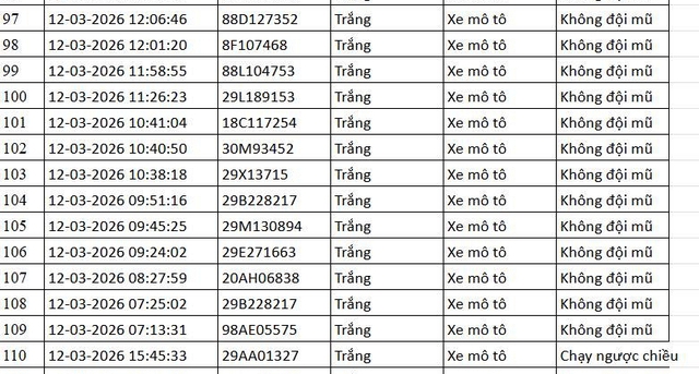 Cục Cảnh sát giao thông cho biết, trong khoảng thời gian từ 7h30 ngày 12/3/2026 đến 7h30 ngày 13/3/2026, thông qua hệ thống camera AI giám sát giao thông, lực lượng chức năng đã phát hiện nhiều trường hợp vi phạm và tiến hành xử lý phạt nguội trên các tuyến cao tốc cũng như tại các nút giao trong nội đô.