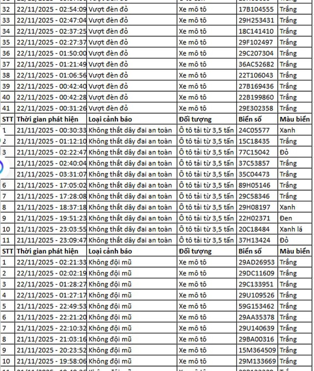 Ngày 22/11, Cục Cảnh sát Giao thông đã công khai danh sách 145 trường hợp phương tiện vi phạm, được phát hiện qua camera AI từ ngày 21/11 đến ngày 22/11.