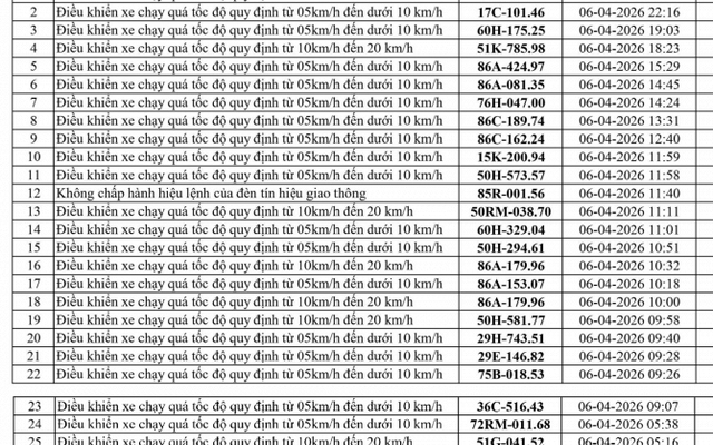 Phòng Cảnh sát giao thông Công an tỉnh Lâm Đồng thông báo, trong tuần từ ngày 06/04/2026 đến ngày 11/04/2026, đã phát hiện 164 trường hợp vi phạm trật tự an toàn giao thông - lỗi chạy quá tốc độ qua hệ thống camera giám sát giao thông và phương tiện thiết bị kỹ thuật nghiệp vụ.