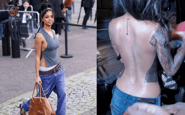 Hậu show diễn, Tyla còn phủ sóng cõi mạng với outfit táo bạo mang hiệu ứng thị giác đặc biệt. Nữ ca sĩ thay thế áo bằng một hình xăm tạm thời phủ khắp phần thân trên, tạo cảm giác như đang mặc một chiếc áo ôm sát cơ thể. Thiết kế hình xăm mang họa tiết giống da rắn, trải dài từ ngực xuống thân và kéo dài đến cánh tay, mô phỏng phom dáng của một chiếc áo dài tay ôm sát. Trong khi đó, phần lưng phía sau lại để trống hoàn toàn, khiến tổng thể trang phục trở nên gợi cảm và nổi bật hơn. Hiệu ứng bóng nhẹ trên bề mặt trang phục càng làm nổi bật vóc dáng "chiến đét" của nữ ca sĩ. Nhiều nguồn tin cho rằng đây là sản phẩm của Simon Carle - một nghệ sĩ trang điểm và body paint (vẽ cơ thể) nổi tiếng người Pháp. Anh từng hợp tác với nhiều nghệ sĩ, stylist và thương hiệu trong các dự án chụp ảnh, video thời trang cũng như biểu diễn nghệ thuật.