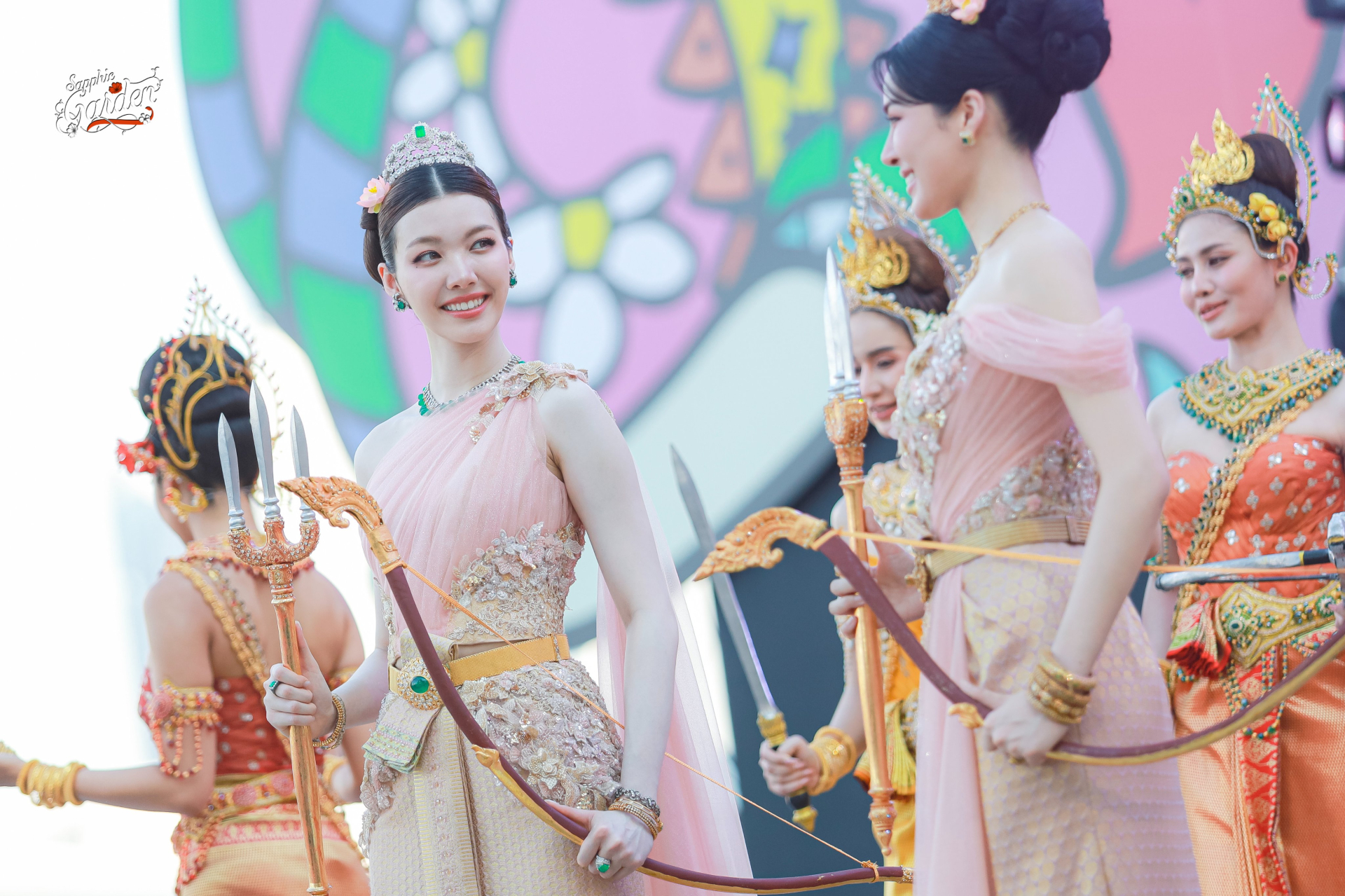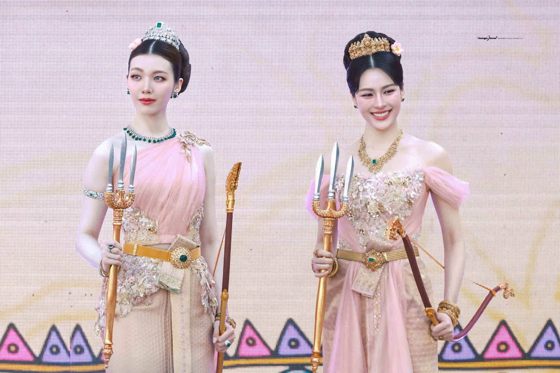 Sức nóng của lễ hội té nước dường như bị lấn át bởi sự xuất hiện của LingOrm. Ngay từ khoảnh khắc cả hai bước ra, toàn bộ không gian của IconSiam như bùng nổ trong tiếng reo hò. 2 mỹ nhân khoác lên mình những bộ Thái phục cổ truyền được may đo tinh xảo đến từng đường kim mũi chỉ, tôn vinh trọn vẹn vẻ đẹp của phụ nữ Thái Lan.