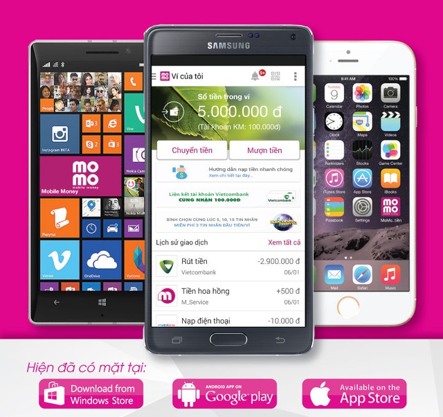 Như vậy, cho đến nay, Ứng dụng Ví MoMo Chuyển tiền đã có mặt trên các nền tảng thông dụng là hệ điều hành Android, iOS và Windows Phone. Điều này đồng nghĩa với việc, những người yêu công nghệ, những người quan tâm đến tài chính hay cả những bà nội trợ, dân văn phòng,… đã có thể dễ dàng tải, cài đặt và sử dụng ứng dụng tài chính cho phép chuyển nhận tiền siêu nhanh (real time) qua số điện thoại di động, thanh toán các hóa đơn và dịch vụ, nạp tiền điện thoại, mua thẻ game hay các mã thẻ, vé xem phim, e-book hay mua thẻ quà tặng online (e-voucher), thanh toán khoản vay cá nhân…