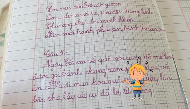 Trong vở ô ly, nét chữ nắn nót màu mực hồng, câu 10 yêu cầu viết về ngày Tết. Cô bé viết: “Ngày Tết em về quê nội cùng bố mẹ. Em được gói bánh chưng, xem pháo hoa và ăn cỗ và đi mua hoa quả trưng bày lên bàn thờ, lạy các cụ đã tử vong".