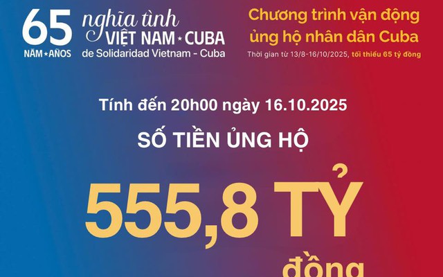 Trung ương Hội Chữ thập đỏ Việt Nam cho biết, tính đến 20:00 ngày 16/10, Chương trình vận động ủng hộ nhân dân Cuba với chủ đề "65 năm nghĩa tình Việt Nam - Cuba" đã đạt 555,8 tỷ đồng với trên 2 triệu lượt ủng hộ. Kết quả này thể hiện sâu sắc tinh thần đoàn kết, hữu nghị và tình cảm thủy chung của nhân dân Việt Nam dành cho nhân dân Cuba.