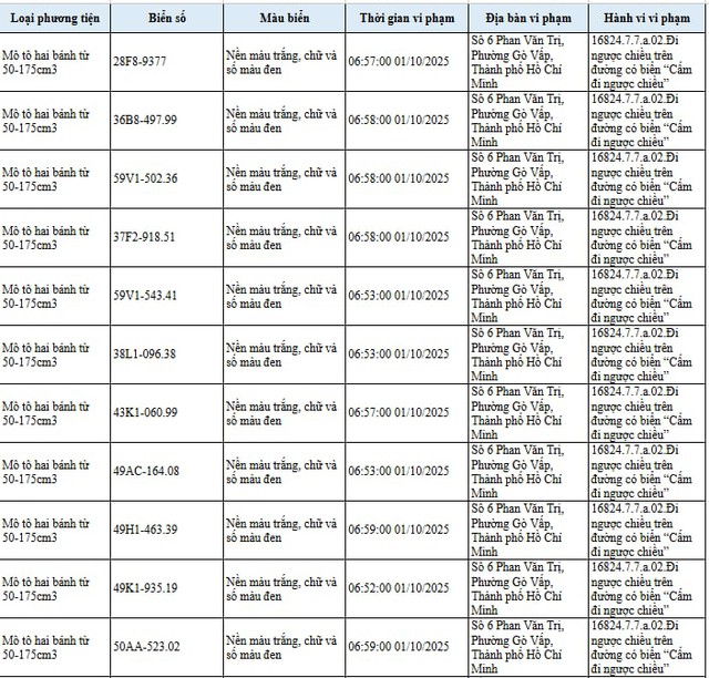 Trước tình hình đó, lực lượng chức năng đã tăng cường ghi hình, gửi thông báo xử lý qua hình ảnh đối với tất cả các trường hợp đi ngược chiều. Chỉ riêng ngày 1/10, Đội Cảnh sát Giao thông đã gửi thông báo vi phạm đến 150 trường hợp vi phạm lỗi Đi ngược chiều trên đường có biển “Cấm đi ngược chiều” tại khu vực đường Phan Văn Trị, phường Gò Vấp.