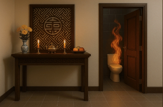 Theo phong thủy, bàn thờ nên được đặt ở vị trí trang nghiêm, tĩnh lặng và tránh luồng khí xấu. Nếu đặt bàn thờ ngay cửa chính, mỗi khi mở cửa, luồng khí ồn ào từ bên ngoài xộc thẳng vào nơi thờ tự, làm tán khí linh, ảnh hưởng đến vận may và tài lộc của gia chủ. Càng đại kỵ hơn nếu bàn thờ ở cạnh hoặc đối diện nhà vệ sinh, vì đây là nơi ô uế, dễ khiến trường khí trong nhà bị nhiễm tạp, công việc dễ gặp trắc trở, tiền vào rồi lại ra.