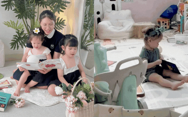 "Mình có tham khảo cách nuôi con của người Do Thái, họ tin rằng trẻ càng tiếp xúc với sách sớm, càng hình thành tình yêu đọc sách cả đời. Và đúng là 2 bé nhà mình cực kỳ mê sách. Với các con, sách không chỉ là 'đồ học', mà còn là món đồ chơi con có thể ngồi xem một mình hàng giờ mà không chán" - mẹ Hà chia sẻ.