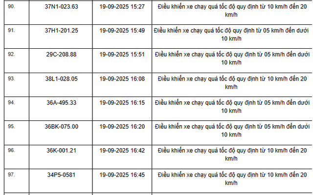 Các lỗi vi phạm chủ yếu: Điều khiển xe chạy quá tốc độ quy định từ 05 km/h đến dưới 10 km/h; Điều khiển xe chạy quá tốc độ quy định từ 10 km/h đến 20 km/h;...