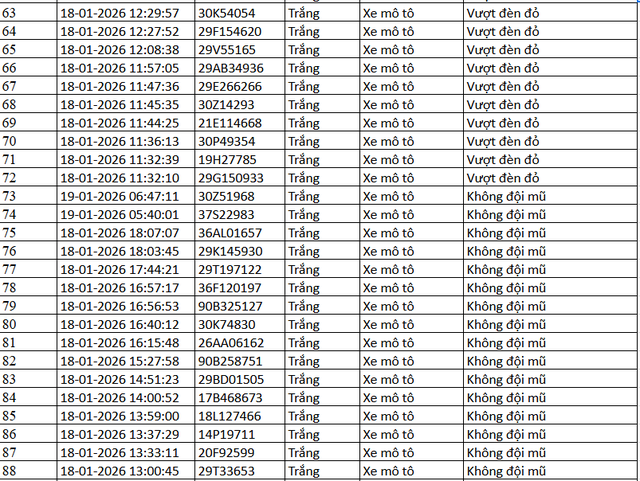 Từ 12h00’ ngày 18/1/2026 đến 12h00’ ngày 19/1/2026, đã phát hiện 88 trường hợp xe máy vi phạm.