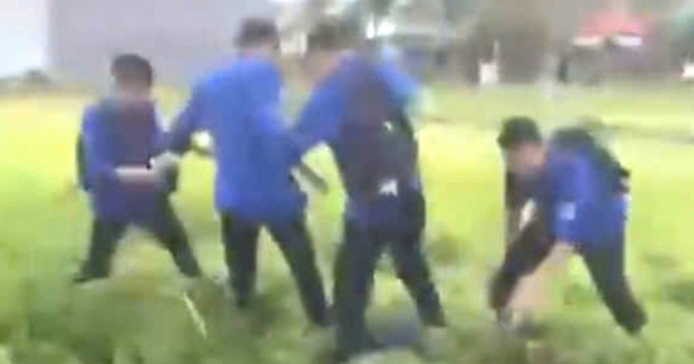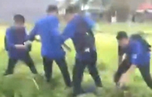 4 học sinh lớp 10 tiếp tục đánh khi em M.B.N. đã bị ngã xuống đất. Ảnh cắt từ clip