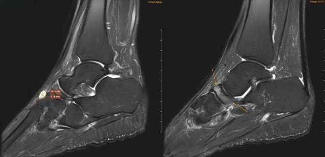 Để xác định nguyên nhân, các bác sĩ đã chỉ định chụp cộng hưởng từ (MRI). Kết quả cho thấy xương ghe bị xẹp và biến dạng điển hình hình “dấu phẩy”, kèm đặc xương dưới sụn và phù tủy xương rõ rệt. Ngoài ra, nhiều tổn thương phối hợp cũng được ghi nhận như gai xương, phù dây chằng, tràn dịch khớp cổ chân.