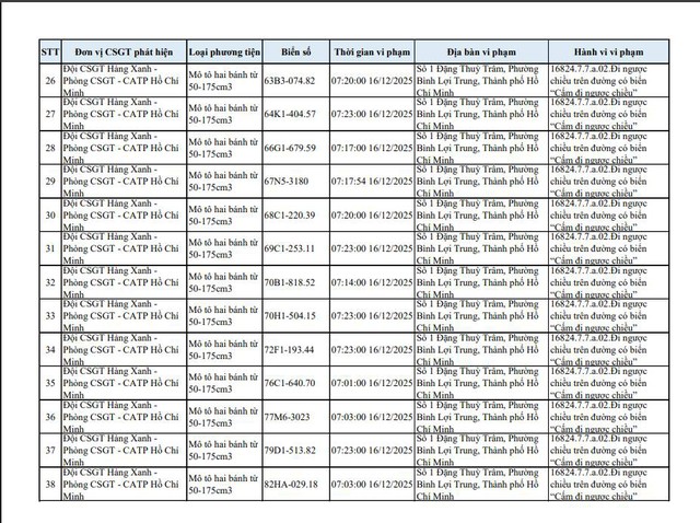 Sáng 16-12, Đội CSGT Hàng Xanh đã ghi hình và gửi thông báo đối với 40 trường hợp vi phạm "Đi ngược chiều trên đường có biển 'Cấm đi ngược chiều'" tại khu vực đường Đặng Thùy Trâm, phường Bình Lợi Trung.
