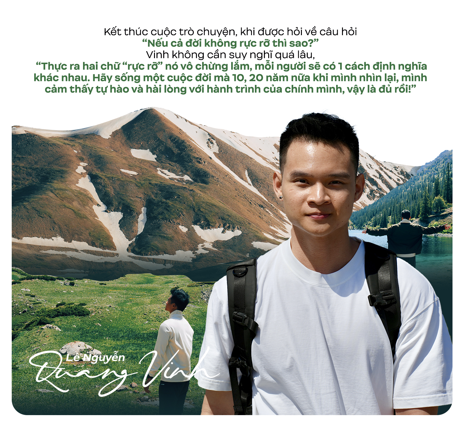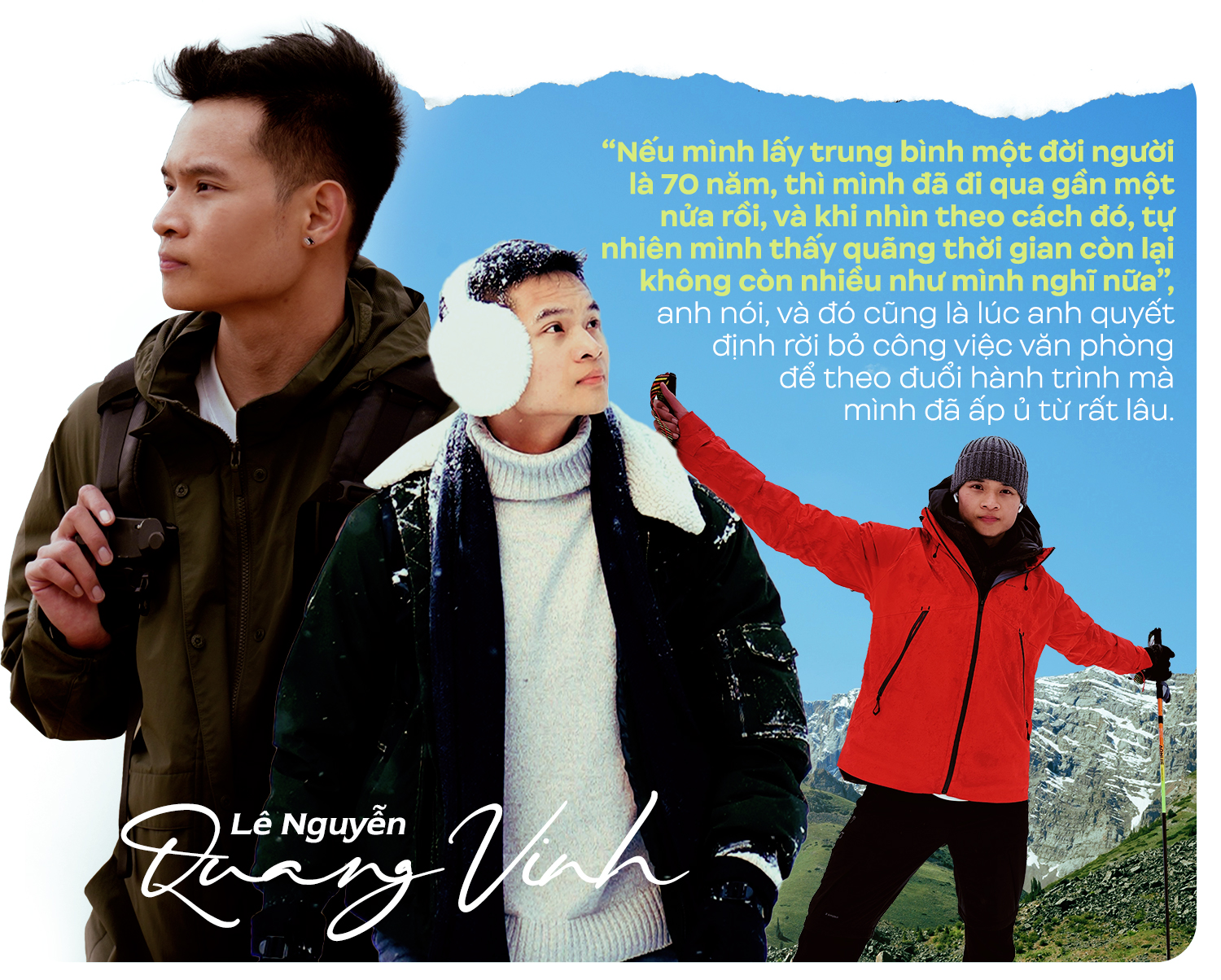 Nếu phải mô tả bản thân bằng ba từ, Vinh lựa chọn “mạo hiểm”, “bình tĩnh” và “mơ mộng”, nhưng anh cũng nhanh chóng làm rõ rằng “mạo hiểm” không phải là bản chất sẵn có, mà là thứ được hình thành dần sau nhiều năm trải nghiệm, sau những lần buộc phải tự giải quyết vấn đề khi đi một mình, và sau cả những lần bước ra khỏi nỗi sợ của chính mình.