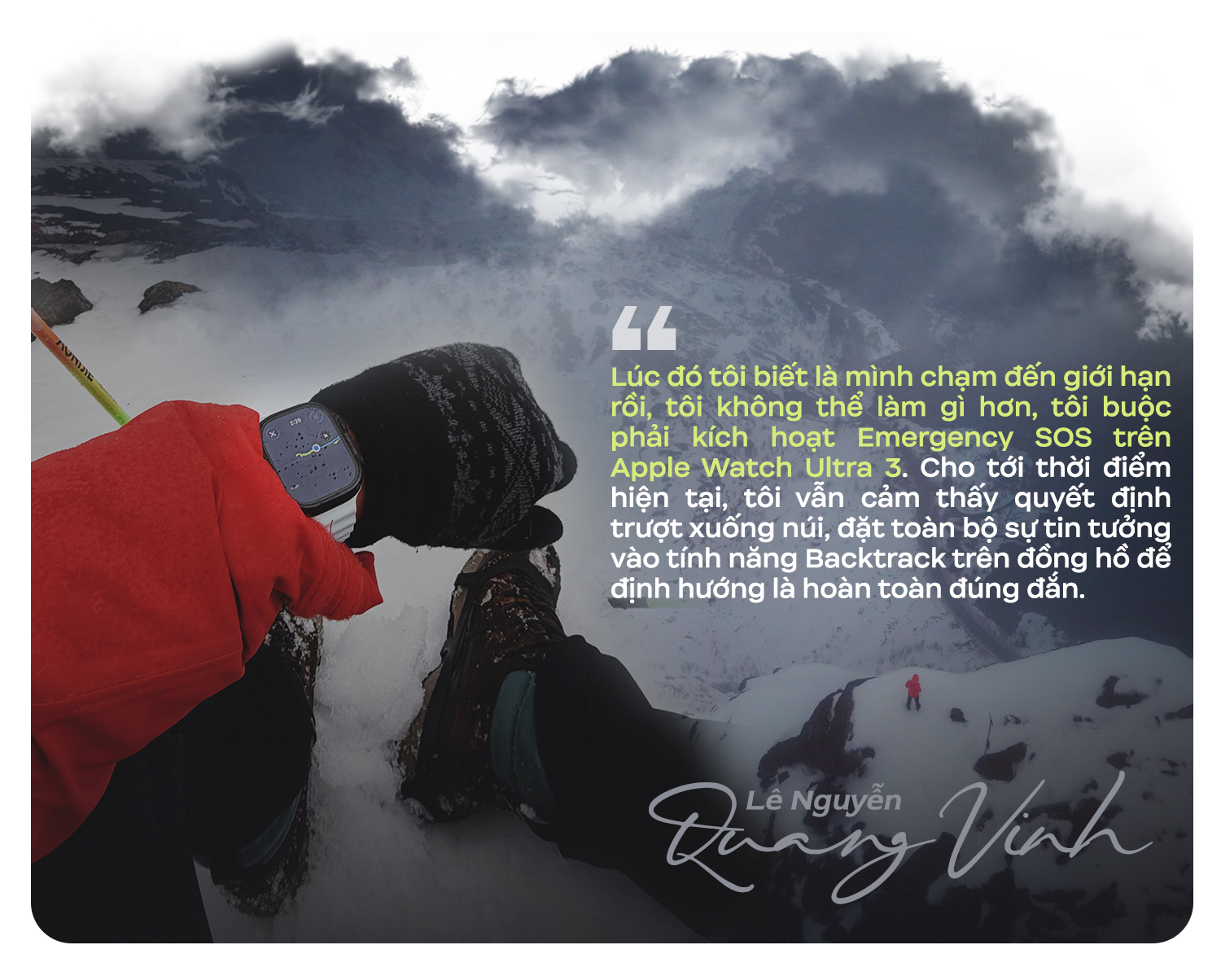 Không thể xác định đường đi, Vinh buộc phải đưa ra một quyết định vô cùng liều lĩnh và đầy rủi ro: trượt xuống núi. Trong gần hai tiếng, anh vừa trượt, vừa dùng gậy ghim xuống tuyết để giữ thăng bằng, vừa liên tục kiểm tra hướng đi trên Apple Watch Ultra 3, trong khi cơ thể dần bị cái lạnh xâm chiếm.