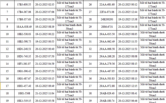 Mới đây, Công an thành phố Hà Nội thông báo danh sách 342 phương tiện vi phạm TTATGT được phát hiện thông qua hệ thống camera AI trong thời gian từ 19/12/2025 đến 21/12/2025. Trong số này có 260 xe máy vi phạm các lỗi như vượt đèn đỏ, đi sai làn, không chấp hành hiệu lệnh giao thông. Phòng Cảnh sát giao thông đã gửi thông báo vi phạm đến các chủ phương tiện theo quy định.