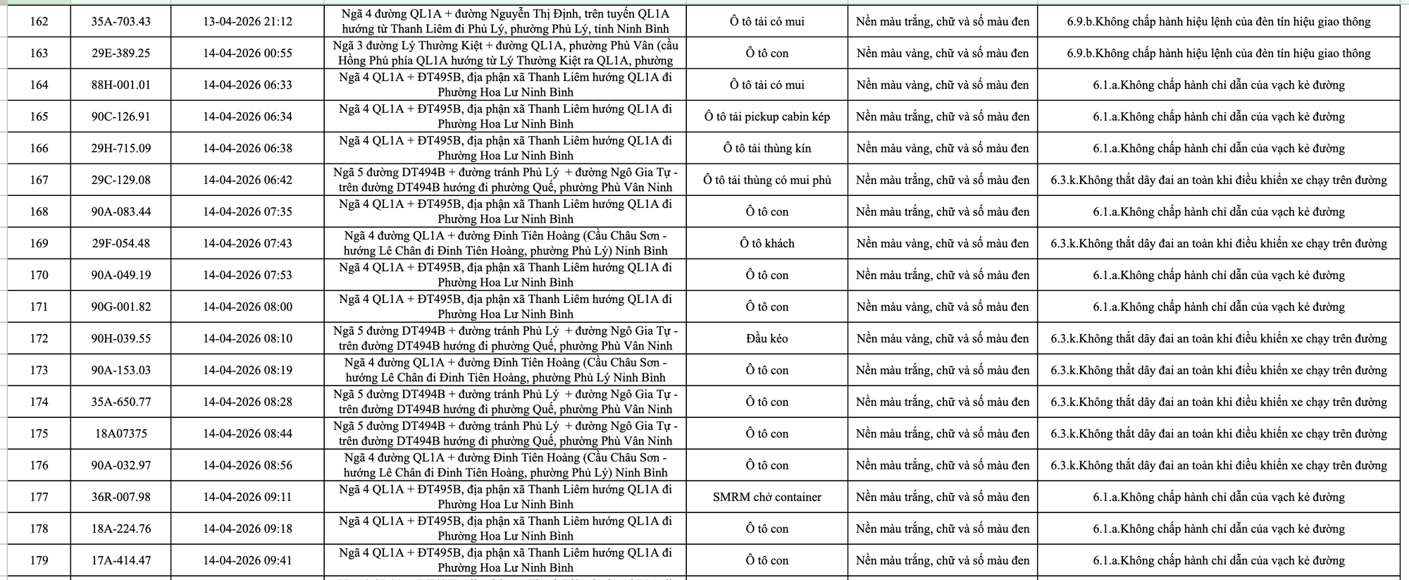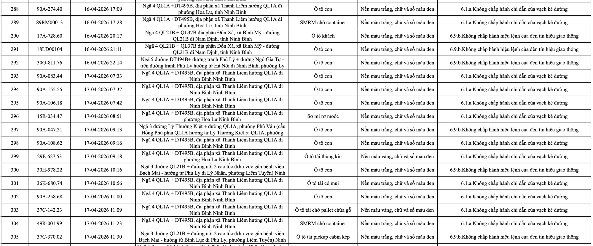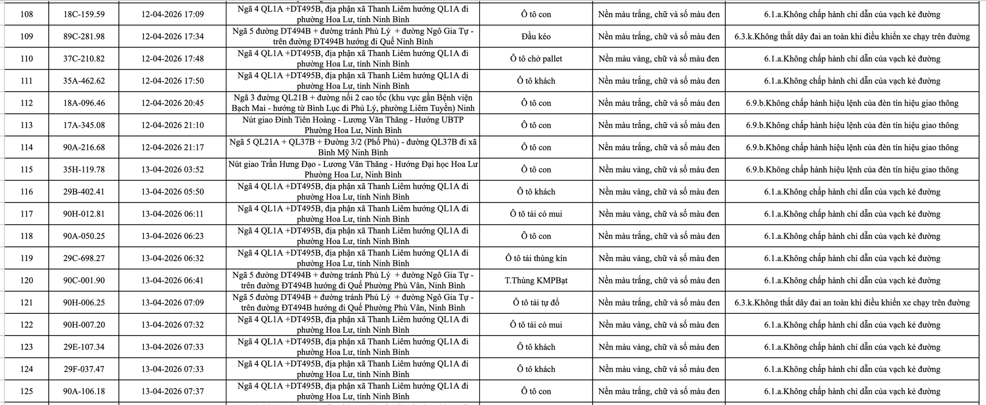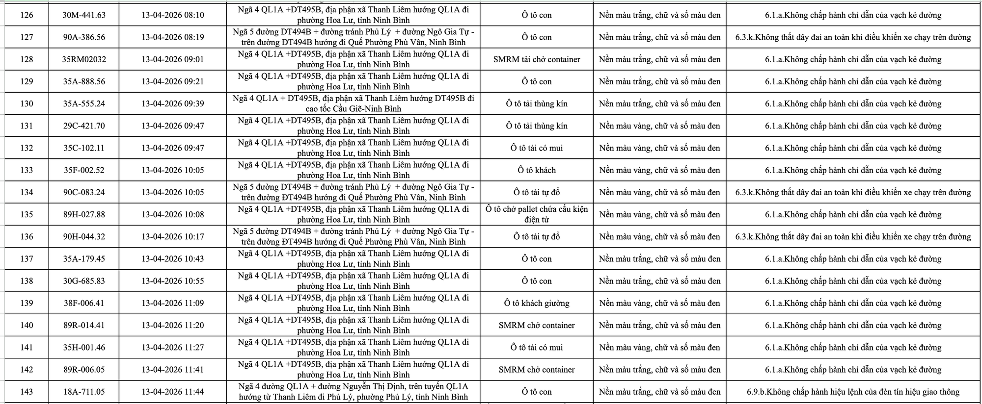 Phòng Cảnh sát giao thông, Công an tỉnh Ninh Bình cho biết, trong tuần qua, từ ngày 11/4/2026 đến ngày 18/4/2026, Phòng Cảnh sát giao thông, Công an tỉnh ghi nhận 413 lượt phương tiện vi phạm Luật Trật tự, an toàn giao thông đường bộ bị xử lý phạt nguội.