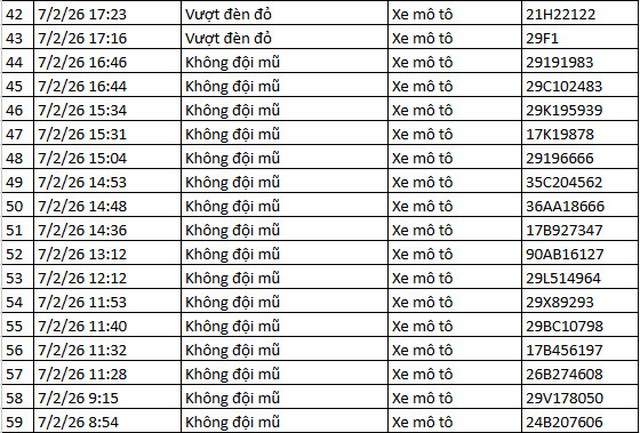 Ngoài ra, Cục Cảnh sát giao thông thông báo, qua trích xuất dữ liệu từ camera A.I được thí điểm lắp đặt tại nội đô Hà Nội, trong 2 ngày cuối tuần 7/2 và 8/2 đã tự động phát hiện: 135 xe máy vi phạm TTATGT tại TP. Hà Nội . Danh sách cụ thể như sau: