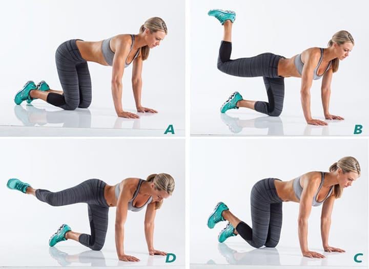 Một lựa chọn khác là Fire Hydrant – động tác quen thuộc trong các giáo án tập mông. Ở tư thế chống tay và gối, người tập nâng chân sang ngang như động tác “mở hông”. Bài tập này giúp kích hoạt sâu nhóm cơ mông giữa, đóng vai trò quan trọng trong việc cải thiện đường cong hai bên hông.