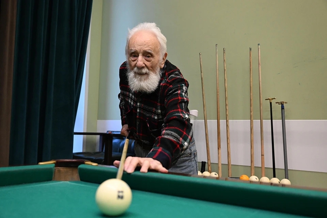 Cụ ông Andrei Velichko, 97 tuổi, người Moscow, vẫn đánh bại được những đối thủ trẻ hơn trong môn bi-a.
