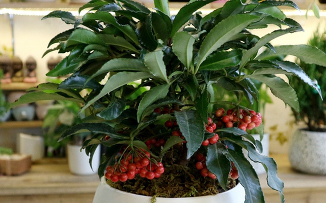 Cây có lá xanh bóng và chùm quả đỏ rực nổi bật. Mỗi cây có thể đậu hàng trăm quả, tạo nên vẻ ngoài bắt mắt. Trong phong thủy, sự kết hợp giữa sắc đỏ và xanh tượng trưng cho sung túc, may mắn và thịnh vượng.