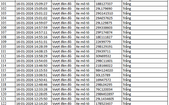 Từ 12h00’ ngày 16/1/2026 đến 12h00’ ngày 17/1/2026, đã tự động phát hiện 145 trường hợp xe máy vi phạm.