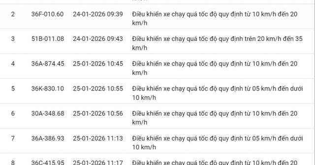 Công an tỉnh Thanh Hóa thông báo, từ ngày 16/01/2026 đến ngày 31/01/2026, thông qua thiết bị kỹ thuật nghiệp vụ, các tổ công tác của phòng CSGT đã phát hiện, ghi nhận bằng hình ảnh đối với tổng số 595 trường hợp phương tiện vi phạm quy định về tốc độ trên các tuyến Quốc lộ. Danh sách biển số vi phạm cụ thể như sau: