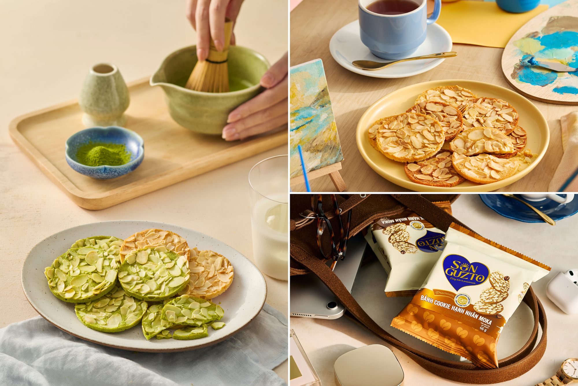 8 vị bánh của Sun Guzto hấp dẫn cả thị giác lẫn vị giác. Bề mặt bánh phủ lát hạnh nhân dày, vàng óng, độ bóng nhẹ của bơ, tỏa hương nướng thơm dịu. Khi cắn vào, bánh giòn tan mà không khô, giữ vị béo ngậy và bùi thơm đặc trưng của hạnh nhân. Người thưởng thức dễ dàng cảm nhận vị ngọt dịu, béo nhẹ, tan trong miệng, một hương vị tinh tế mà ít dòng cookie công nghiệp nào có được.
