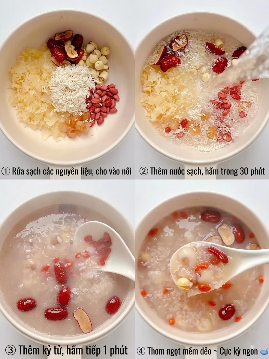Các nguyên liệu khác gồm gạo nếp, táo đỏ, nấm tuyết, kỷ tử, lạc kết hợp với nhau tạo ra món ăn có tính bổ dưỡng, ấm áp (dương từ gạo nếp, lạc), bổ khí huyết (dưỡng âm từ nấm tuyết/táo đỏ/kỷ tử). Sự kết hợp này giúp bồi bổ cơ thể, làm mát gan, giảm căng thẳng, tốt cho tiêu hóa và dưỡng da.