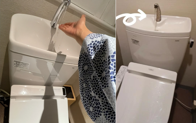 Một số bồn cầu ở Nhật có vòi rửa tay phía trên. Nước rửa tay sẽ chảy xuống két để dùng cho lần xả sau, vừa tiết kiệm nước vừa tiện lợi. Thiết kế này phù hợp với nhà nhỏ vì tận dụng tối đa diện tích mà vẫn đảm bảo vệ sinh.