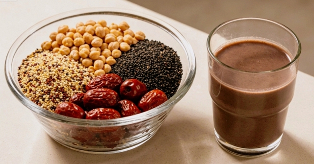 Nguyên liệu: 20g táo đỏ bỏ hạt, 15g hạt mè đen rang chín, 15g hạt quinoa ba màu, 15g đậu gà, 25g đậu nành khô.