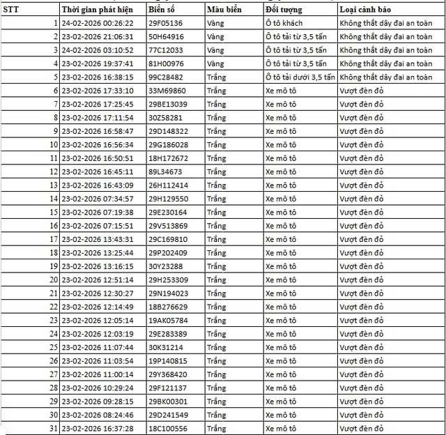 Theo đó, vào ngày 24/2, Cục Cảnh sát Giao thông đã công khai danh sách 67 trường hợp vi phạm trật tự, an toàn giao thông, được phát hiện qua hệ thống camera AI trong ngày 23/2 và 24/2.
