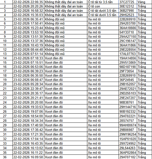 Danh sách các phương tiện vi phạm được phát hiện qua hệ thống camera AI từ ngày 22/2 đến 23/2 (Nguồn: Cục Cảnh sát Giao thông)