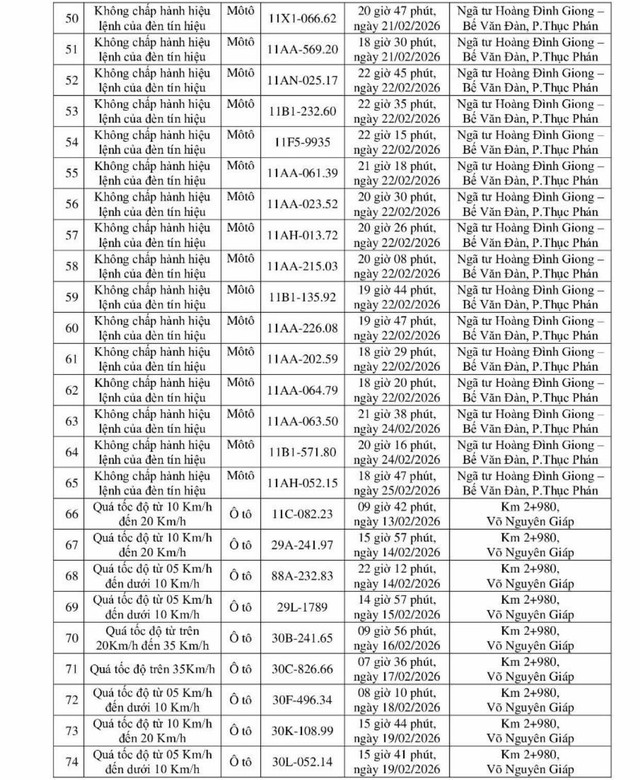 Các trường hợp được phát hiện vi phạm từ ngày 12/2 đến ngày 25/2.