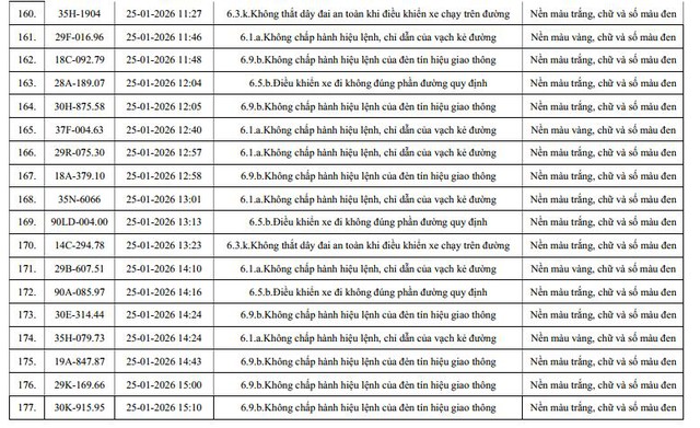 Căn cứ dữ liệu thu thập từ hệ thống giám sát, Phòng CSGT thông báo danh sách phương tiện vi phạm trật tự an toàn giao thông được ghi nhận qua hình ảnh như sau: