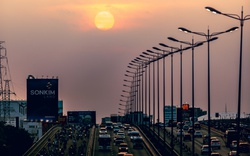 Chiều 23/2, mặt trời đỏ rực nhuộm cam bầu trời dưới chân cầu Sài Gòn ở TP.HCM, khiến nhiều người giữa dòng xe tan tầm phải chậm lại để ngắm nhìn và ghi lại khoảnh khắc đẹp hiếm có.