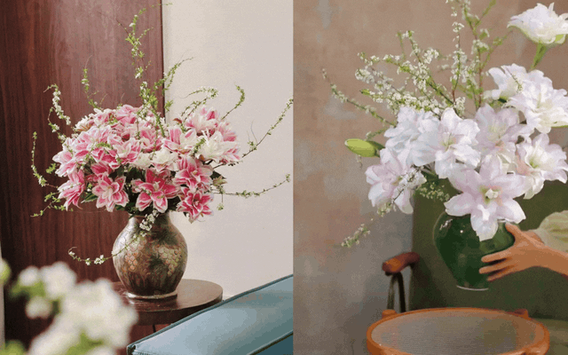 Để hơi hoa "đúng bài", không bị sến, bí quyết nằm ở sự tiết chế. Về bình hoa, bạn nên chọn dáng tròn hoặc dáng cao cổ hẹp, màu trung tính như trắng, be, nâu, ghi đá. Khi cắm, ưu tiên để ly nở tự nhiên, không nhồi quá dày; tuyết mai chỉ cần vừa đủ để tạo độ bay và cảm giác chuyển động. Dù cắm tròn xen kẽ hai loại hoa hay cắm lệch mỗi bên 1 loại, mỗi cách sẽ đẹp một kiểu riêng. Bình hoa này có thể để được đến nửa tháng vì cả 2 đều là loại hoa nở bền.
