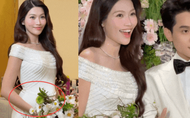 Cô dâu Quỳnh Châu trang điểm và làm tóc nhẹ nhàng, diện váy cưới đơn giản để thực hiện các nghi thức. Đáng nói, qua chiếc váy ôm sát, Quỳnh Châu lộ rõ vòng 2 nay đã nhô lên thấy rõ, dấu hiệu như phụ nữ đang có tin vui. Dễ dàng nhận ra, xuyên suốt những hôn lễ gần đây, nàng hậu có thói quen dùng bó hoa cưới to đặt trước bụng để tránh sự tập trung vào vóc dáng hiện tại. Với loạt hint này, cư dân mạng rần rần chúc mừng vì cho rằng Quỳnh Châu và Ngọc Phát có song hỷ.