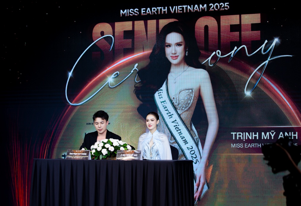 Tại phần giao lưu với báo chí, Trịnh Mỹ Anh diện áo dài Linh San, tự tin trả lời trước các thắc mắc xoay quanh quá trình chuẩn bị của mình. Cô khẳng định kể từ giây phút đăng quang đến nay, bản thân đã không ngừng nỗ lực – từng ngày trau dồi, rèn luyện và hoàn thiện mình để sẵn sàng cho hành trình Miss Earth 2025 sắp tới.