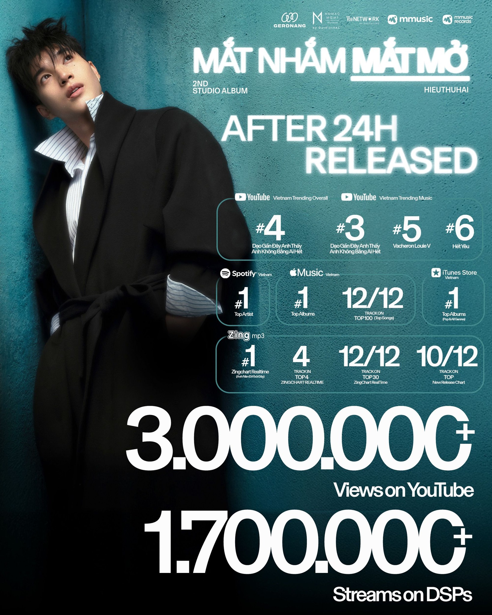 Những con số HIEUTHUHAI gặt hái được sau 1 ngày release album Mắt Nhắm Mắt Mở