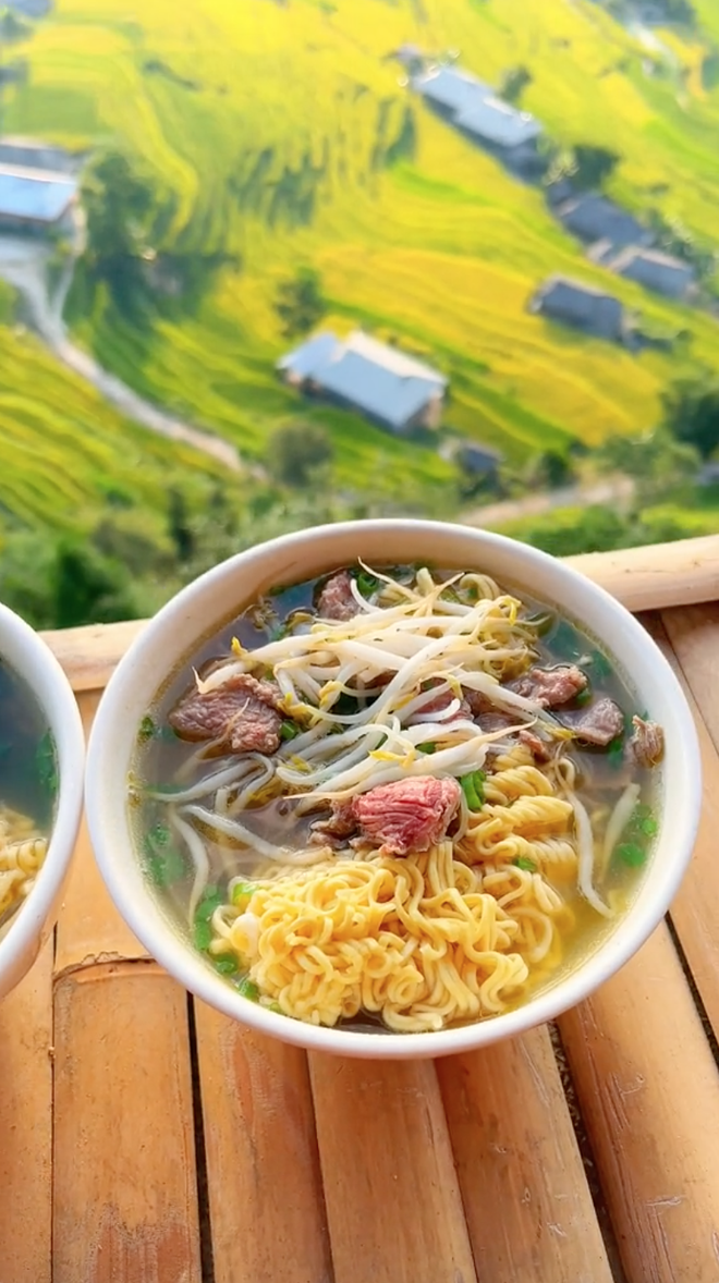 Nhắc đến "view triệu đô", nếu như trước đây hẳn mọi người sẽ hình dung ngay đến một khu nghỉ dưỡng sang chảnh nào đó, hay một khách sạn 5 sao, có view nhìn ra biển, các công trình nổi tiếng hay thành phố phồn hoa. Thế nhưng giờ đây, "view triệu đô" còn được ưa chuộng sử dụng cho một địa điểm khác. Đó chính là view đồi núi bạt ngàn, xanh ngắt với những đám mây lơ lửng bao quanh, hay là thung lũng với ruộng bậc thang đến mùa lúa chín vàng ươm... Và cũng từ đó mà xuất hiện trào lưu ăn mì tôm ở "view triệu đô" của các tín đồ thích đi phượt.
