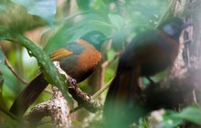 Trong số đó, Khướu đầu đen má xám nổi bật nhờ bộ lông sặc sỡ và tiếng hót trong trẻo. Chim trưởng thành dài khoảng 26 – 28 cm, đầu đen tuyền, hai bên má và quanh mắt có sắc xám bạc, tạo nên vẻ tương phản rõ nét. Ngực và bụng phủ màu nâu đỏ gỉ sắt, vòng cổ và lưng trên ánh nâu đỏ, trong khi cánh mang sắc vàng ôliu pha đen và nâu hạt dẻ. Đuôi chim cũng có viền vàng ôliu mềm mại, tạo cảm giác vừa mạnh mẽ vừa duyên dáng.