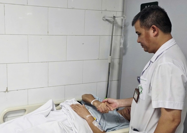 TS.BS Nguyễn Trung Nguyên - Giám đốc Trung tâm Chống độc, Bệnh viện Bạch Mai kiểm tra phản xạ của các bệnh nhân ngộ độc cá chình.