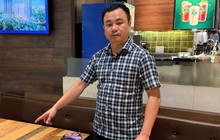 Không tìm kịp chỗ trú mưa, một chủ quán bán hàng rong bên lề đường chấp nhận trú tạm dưới chiếc ô nhỏ. (Ảnh: Hoàng Anh)