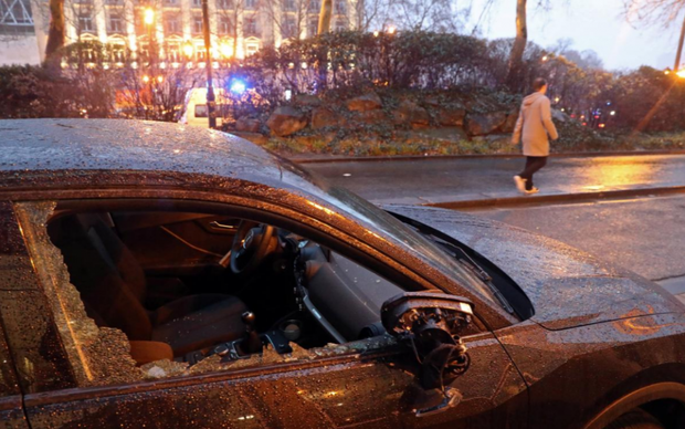 Một chiếc ô tô bị vỡ kính sau biểu tình ở Brussels.