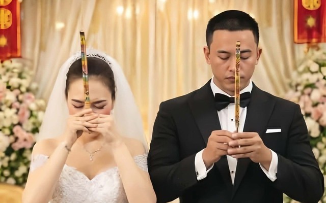Khoảnh khắc cả hai trong trang phục áo cưới như đang làm lễ gia tiên gây sốt mạng xã hội. Dù biết rõ là sản phẩm photoshop, dân mạng vẫn rần rần chia sẻ vì quá hợp vibe và trông đẹp đôi đến lạ.