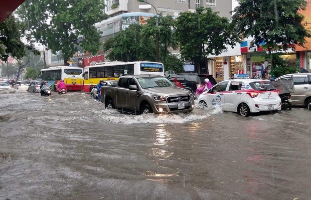 Do ảnh hưởng của cơn bão số 2 (bão Talas), từ đêm qua khu vực Hà Nội đã có mưa rào và giông. Đến khoảng 9h sáng 17/7, cơn mưa to như trút nước phủ rộng trên toàn địa bàn khiến nhiều con đường, tuyến phố ngập sâu.
