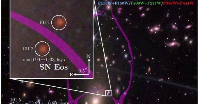 Siêu tân tinh Eos (SN Eos) từ vũ trụ sơ khai được thấu kính hấp dẫn nhân bản và phóng to trong dữ liệu từ kính viễn vọng - Ảnh: NASA/ESA/CSA